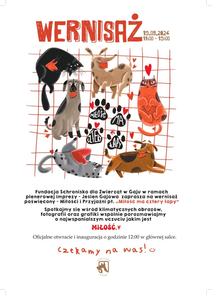 W trakcie Jesieni Gajowej odbędzie się wernisaż poświęcony miłości i przyjaźni pt.: „Miłość ma cztery łapy”. Spotkajmy się wśród klimatycznych obrazów, fotografii oraz grafik. Wspólnie porozmawiajmy o uczuciu jakim jest MIŁOŚĆ! Oficjalne otwarcie i inauguracja wystawy odbędzie się o godzinie 12:00 w głównej salce Centrum Edukacyjnego. 🙂