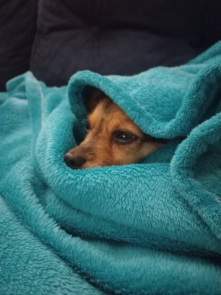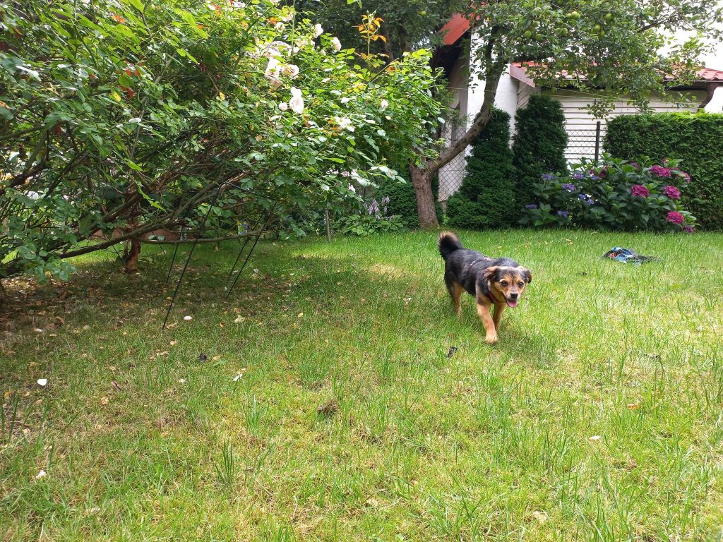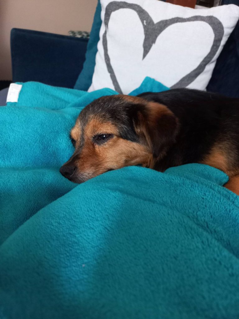 „1 marca – dokładnie rok od adopcji Majeczki.❤️ Mnóstwo cierpliwości i morze miłości chyba przyniosło efekty, bo dziś jest innym pieskiem. Ma nadal swoje lęki, ale jest bardzo radosnym pieskiem, a jej spokojny sen wynagradza nam wszystkie trudy.