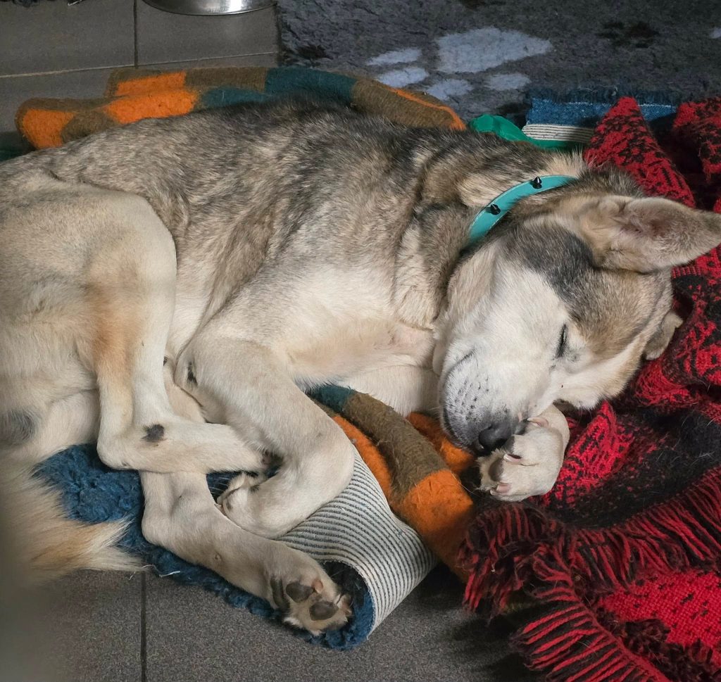 Ruszyliśmy i tak oto DZIŚ Puffi śpi już na ciepłym kocyku w budynku, a nie w czymś co miało być schronieniem – „budą” pod gołym niebem.